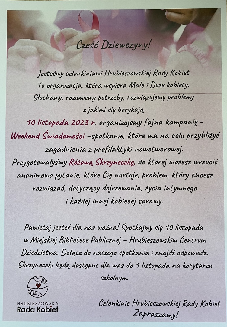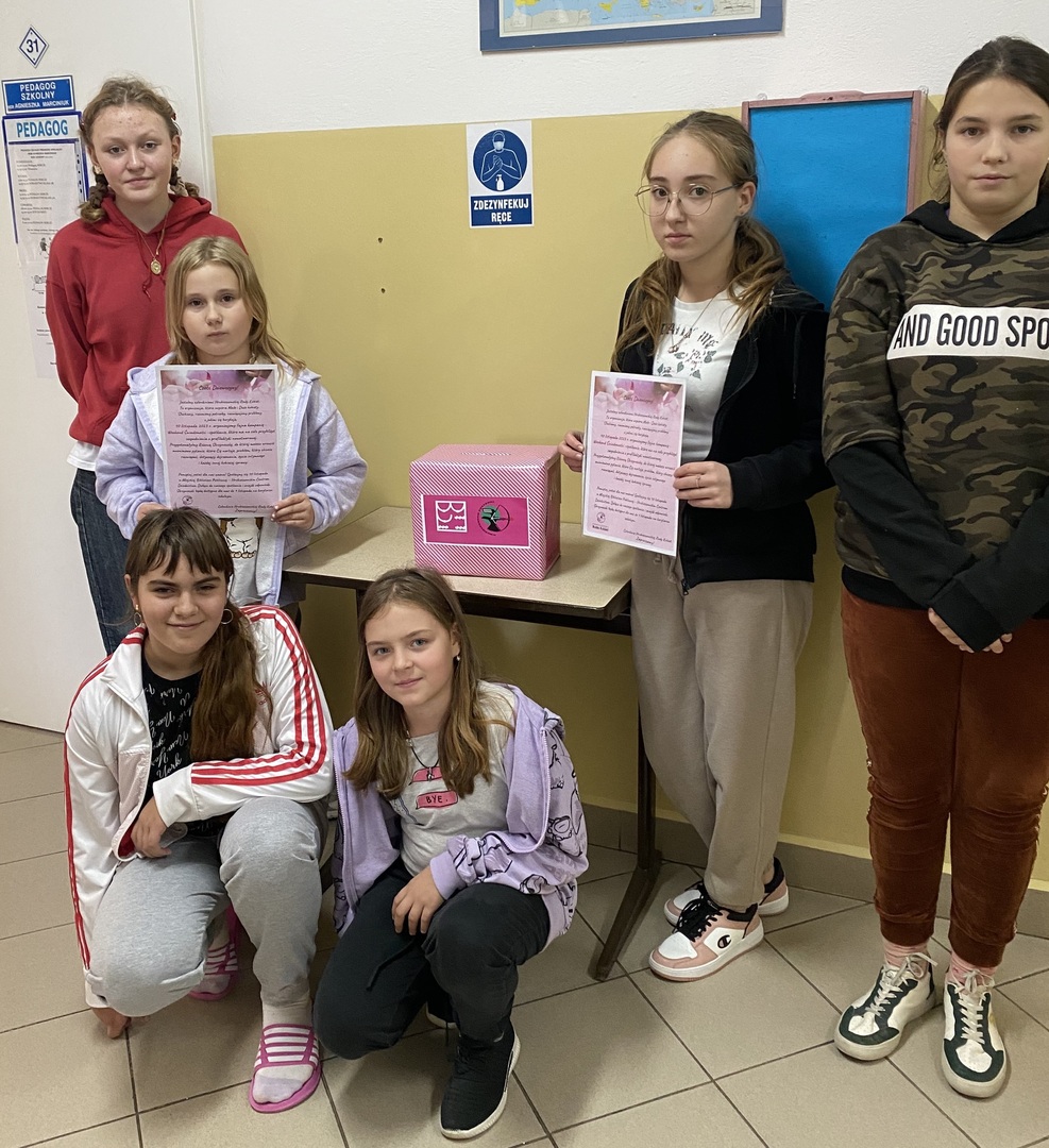 W naszej szkole znajduje się RÓŻOWA SKRZYNKA, do której można wrzucić anonimowo pytanie, które Cię nurtuje, problem, który chcesz rozwiązać, dotyczący dojrzewania, życia intymnego i każdej innej kobiecej sprawy. Skrzynka znajduje się na poddaszu przy sali 31 gabinet pedagoga/psychologa. Dnia 18 pażdziernika odbyło się pierwsze spotkanie wprowadzające ze wszystkimi uczennicami od klasy 5 do 8.