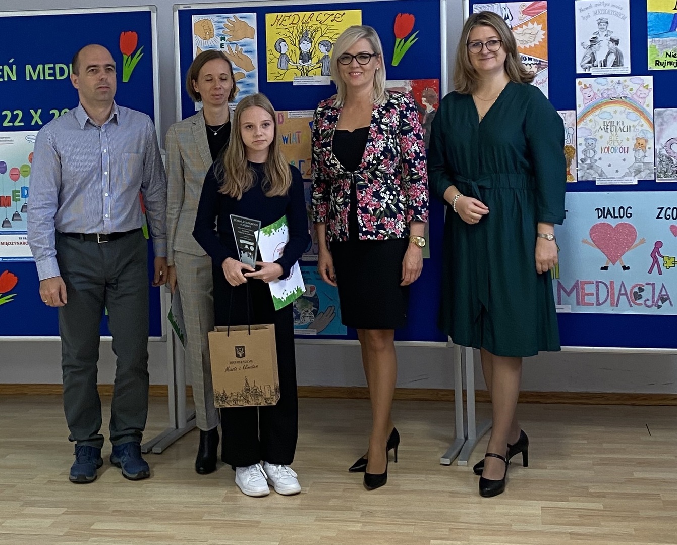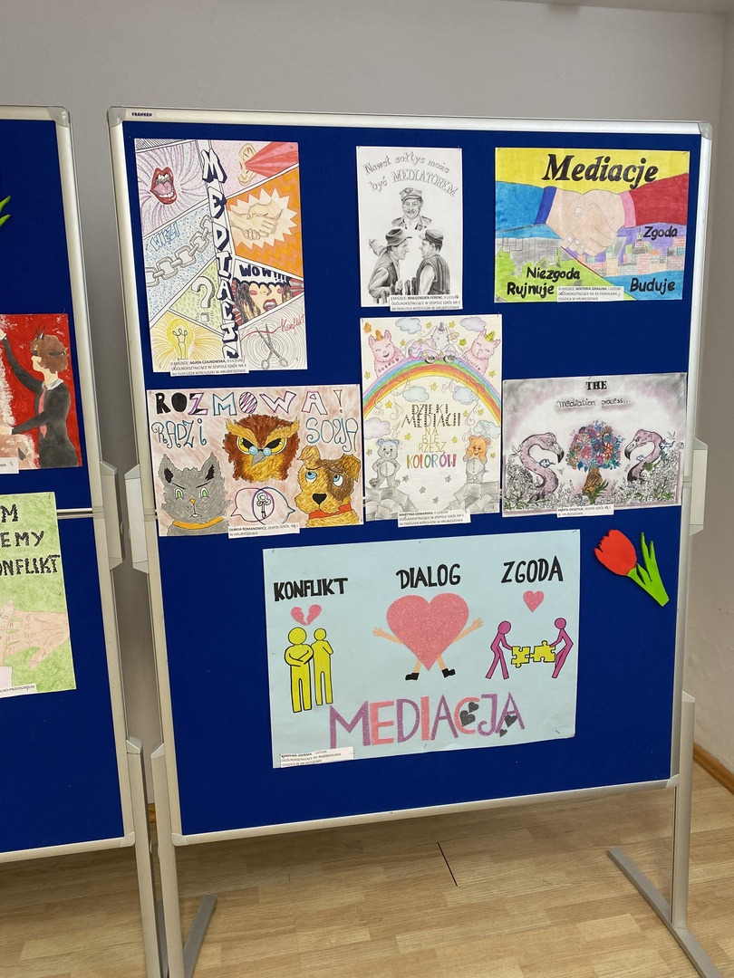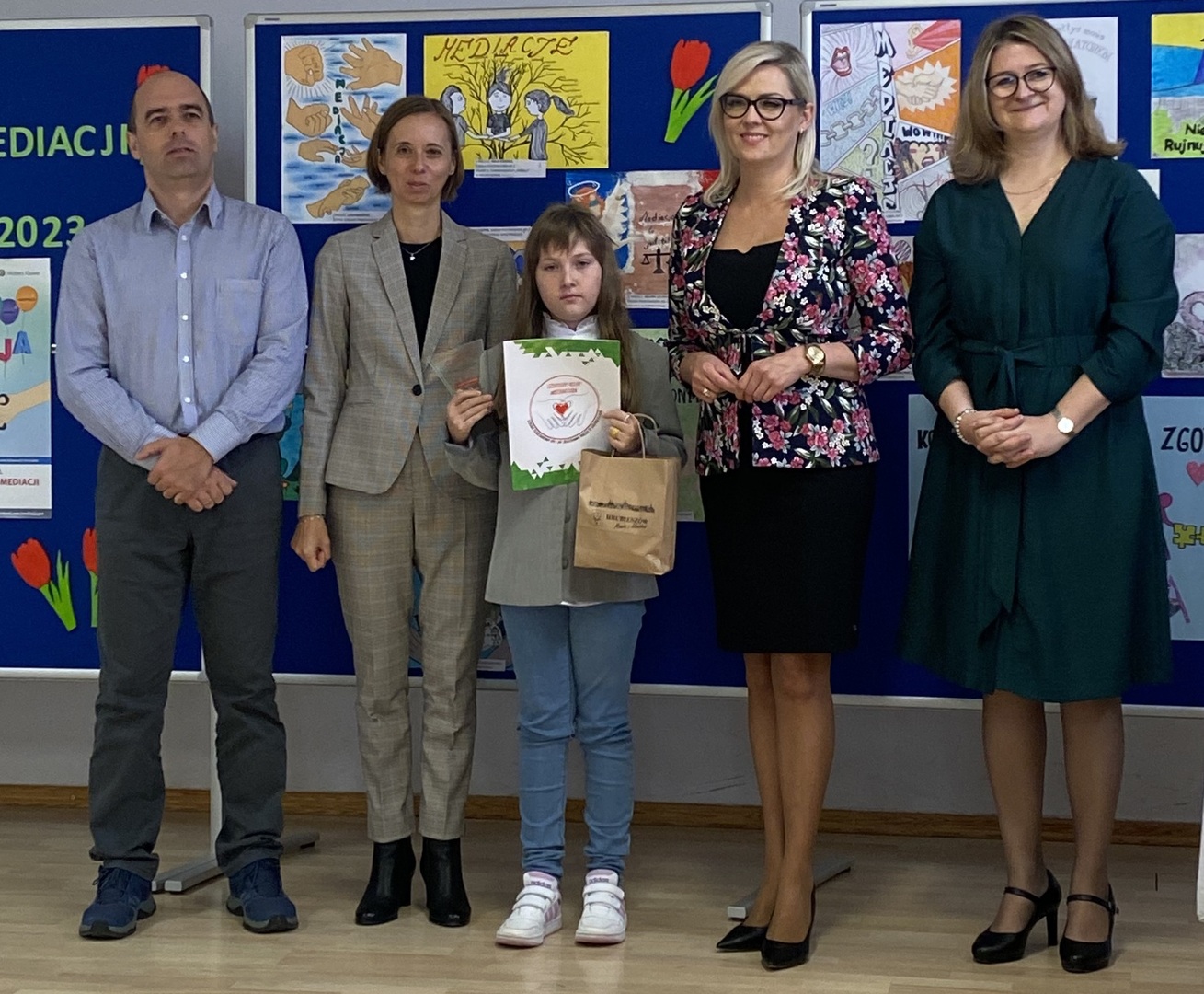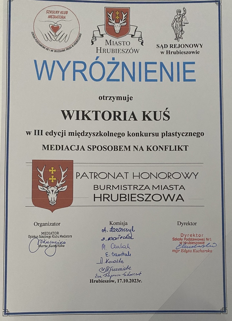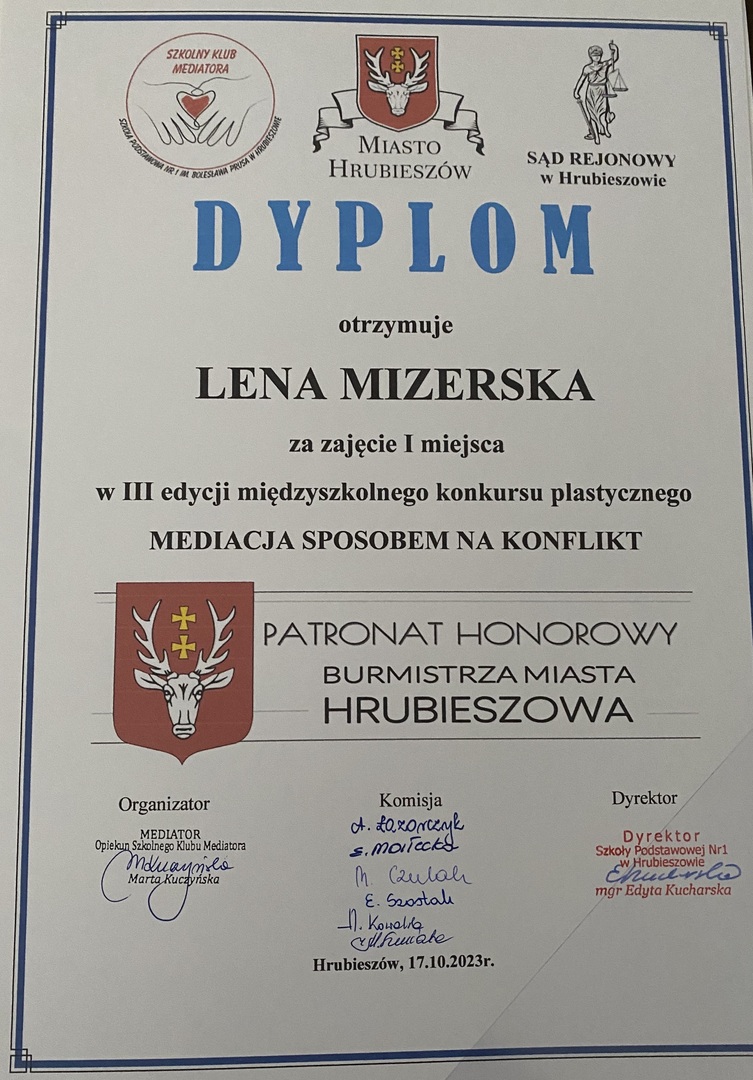 W dniu 17.10.2023r., w Szkole Podstawowej Nr 1 im. Bolesława Prusa w Hrubieszowie, podsumowano III edycję międzyszkolnego konkursu plastycznego pt. „Mediacja sposobem na konflikt”. Konkurs odbywał się pod patronatem honorowym Burmistrza Miasta Hrubieszowa Pani Marty Majewskiej oraz pod patronatem honorowym Prezesa Sądu Rejonowego w Hrubieszowie Pana Adama Pisiewicza.