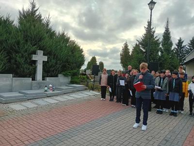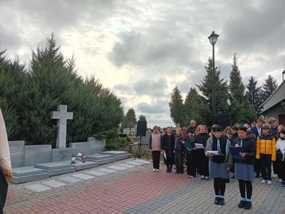a następnie wysłuchaliśmy poezji i pieśni patriotycznych. Uroczystość wzbogaciła wspólna modlitwa w intencji pomordowanych żołnierzy oraz pokoju na świecie, którą poprowadził Ksiądz Tomasz Giergiel. Przedstawiciele Urzędu Gminy, a także szkół złożyli wieńce, wiązanki oraz zapalili znicze.