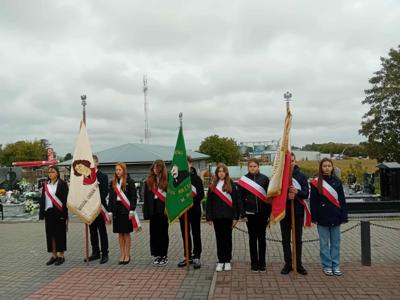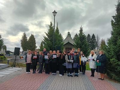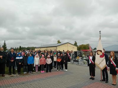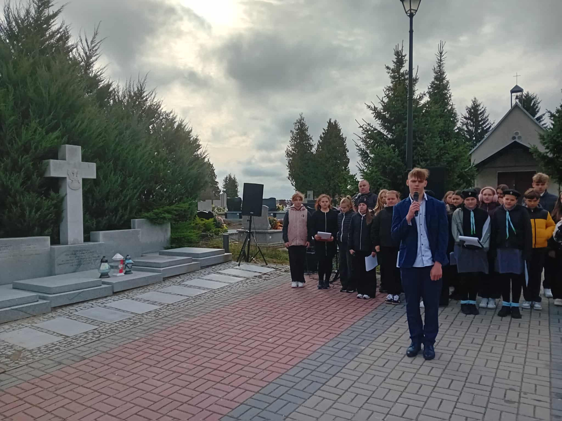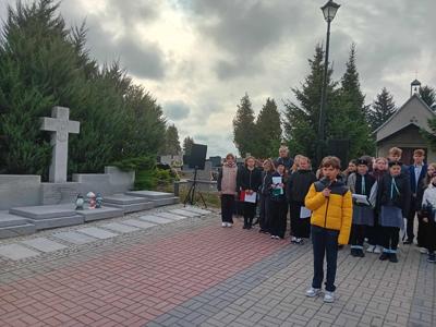 z uczniami zgromadzili się na cmentarzu parafialnym, aby przypomnieć te chwile oraz uczcić bohaterów. Zebranych powitała Pani Wicedyrektor Bożena Frąk, a następnie odśpiewaliśmy hymn państwowy. Zastępca Wójta Pan Krzysztof Filipowicz w swoim przemówieniu zwrócił uwagę na to, jak ważna jest wolność ojczyzny oraz pamięć o patriotach, których już nie ma z nami. Harcerki zaprezentowały rys historyczny dotyczący wydarzeń z 1939 r. we wsi Miętkie,